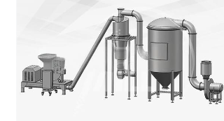 1.自動吸料倉、2.粉碎機、3連接管道、4.旋風分離器、5閉風器、6除塵排風箱、7排風外接管道、8收集桶、9..電器控制盒、10電器柜、